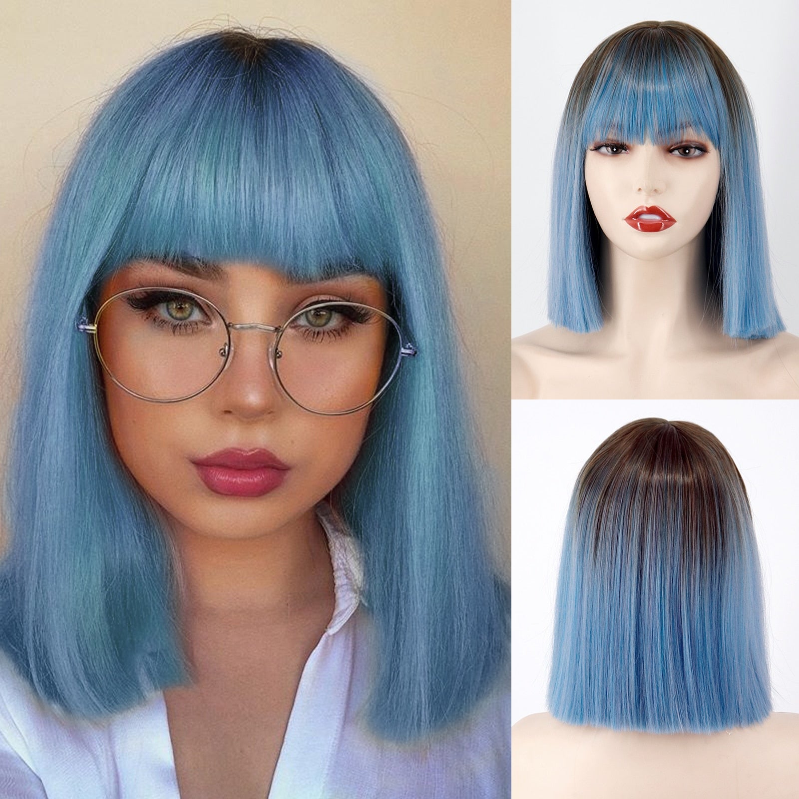 Design: A stunning ombre blue medium-length wig featuring a sleek blunt cut with soft bangs for a bold yet sophisticated look. The straight texture enhances its vibrant gradient tones, making it perfect for standout styling.