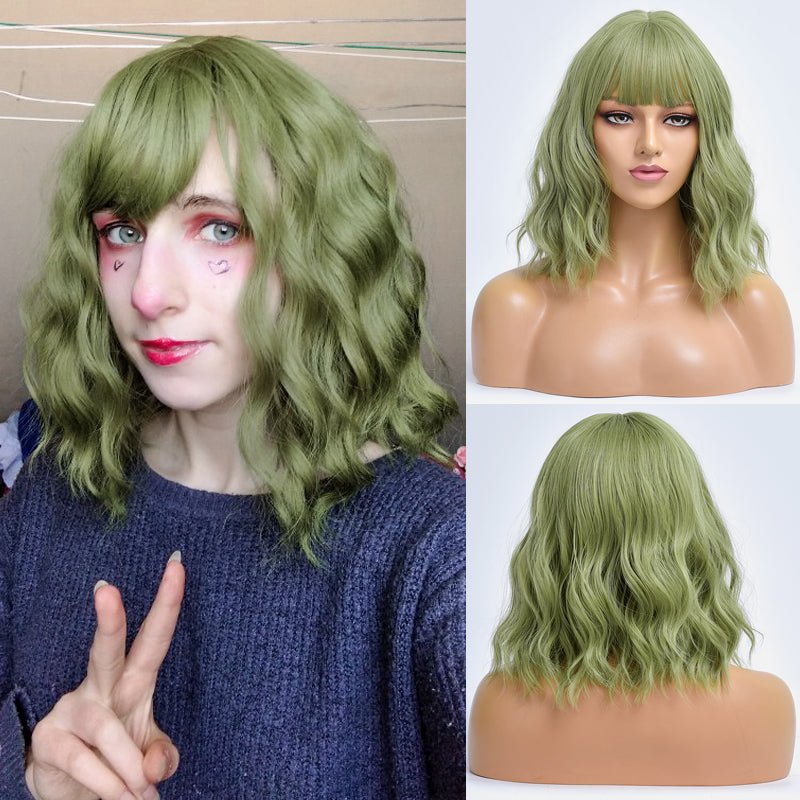 Olive Green Bob Body Wave Synthetic Wigs with Bangs