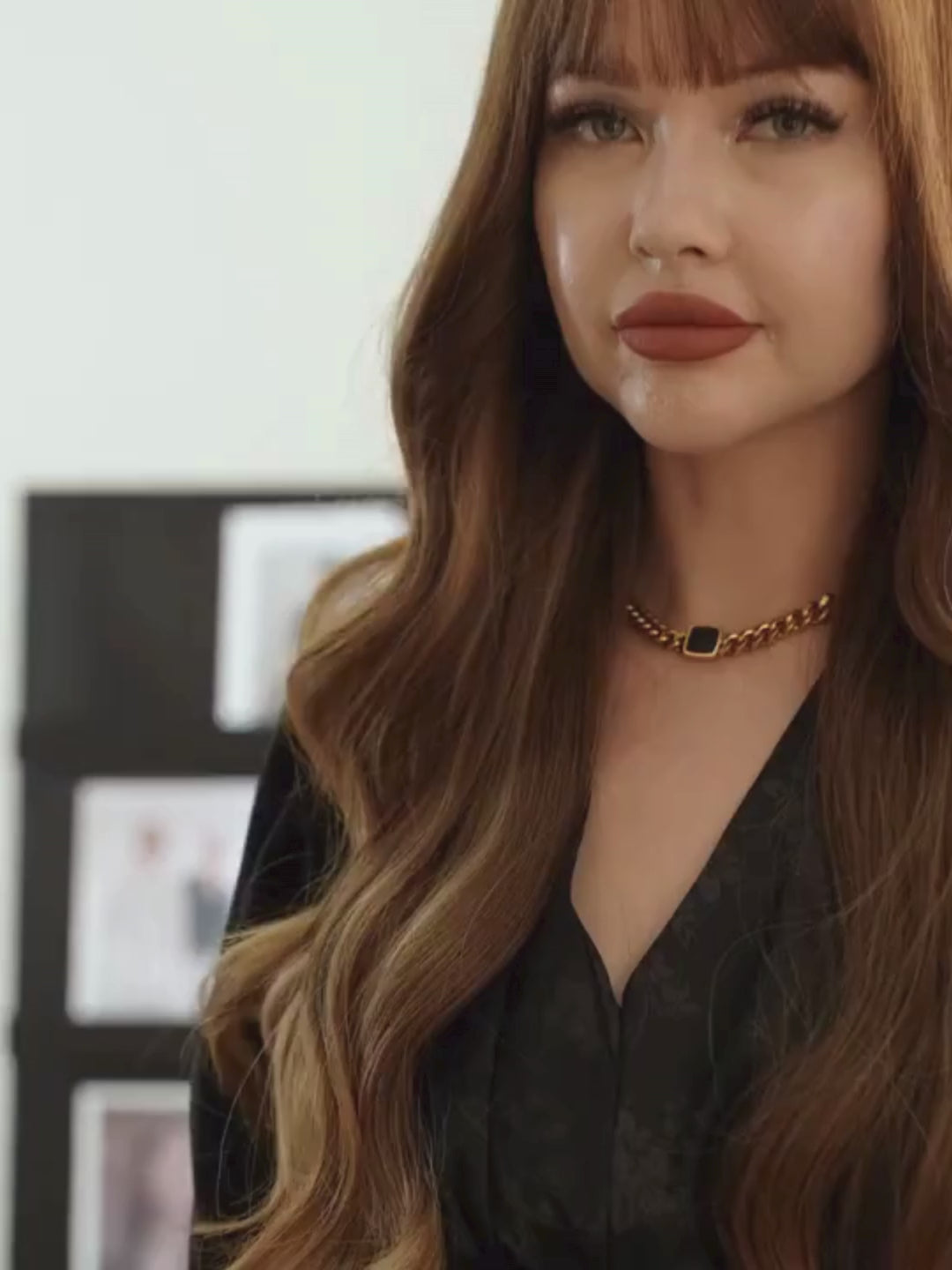 Design: A rich brown-blonde wavy wig with neat bangs, offering a soft, natural look with an elegant touch.