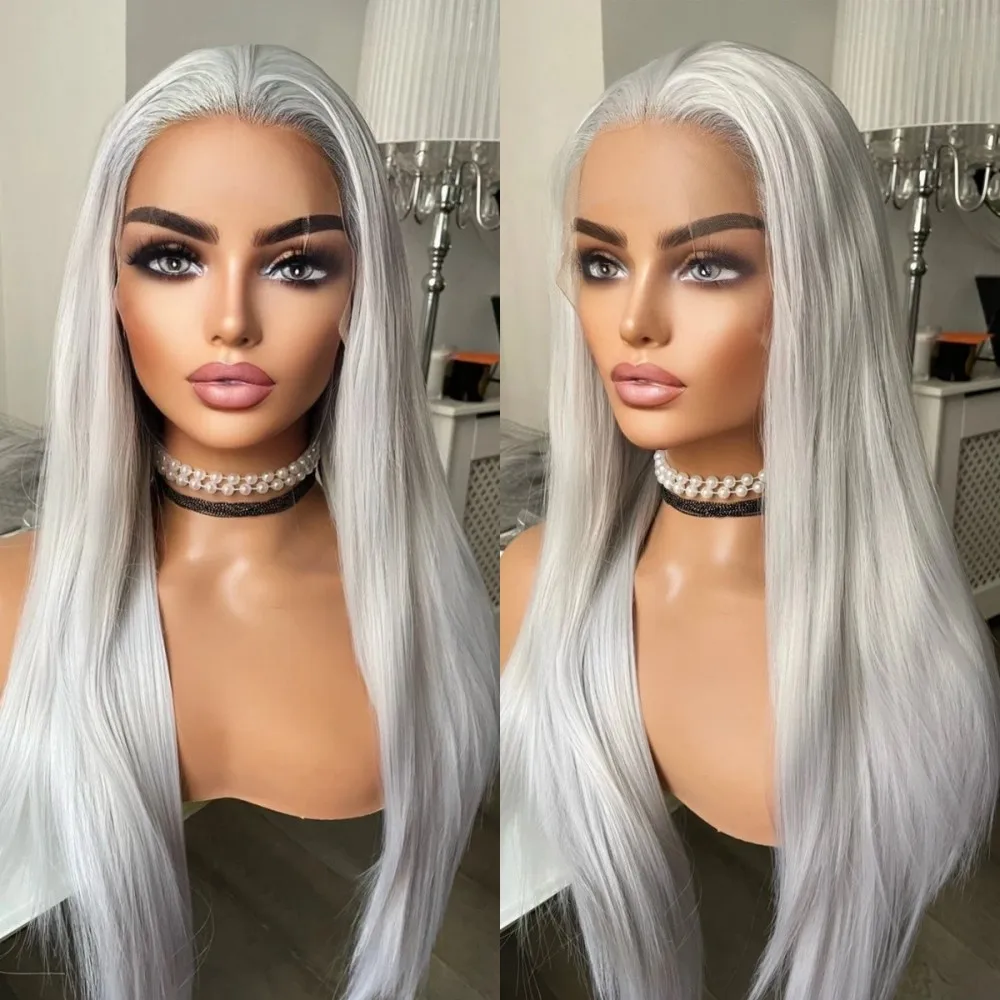 Peluca de encaje frontal de 13x4 de color rubio hielo con fibras sintéticas resistentes al calor que imitan el cabello humano. Tiene una textura lisa, una longitud de 22 pulgadas, una densidad del 150 % y una base de encaje suizo. Perfecta para uso diario o cosplay, con línea de cabello precortada, gorro ajustable y peines seguros.
