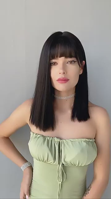 Peluca sintética negra recta bob con flequillo