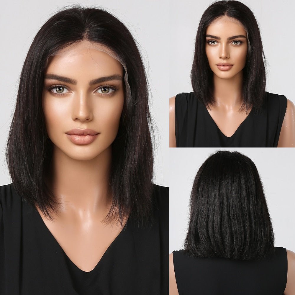 Peluca con encaje frontal y corte bob de cabello humano Remy negro apagado