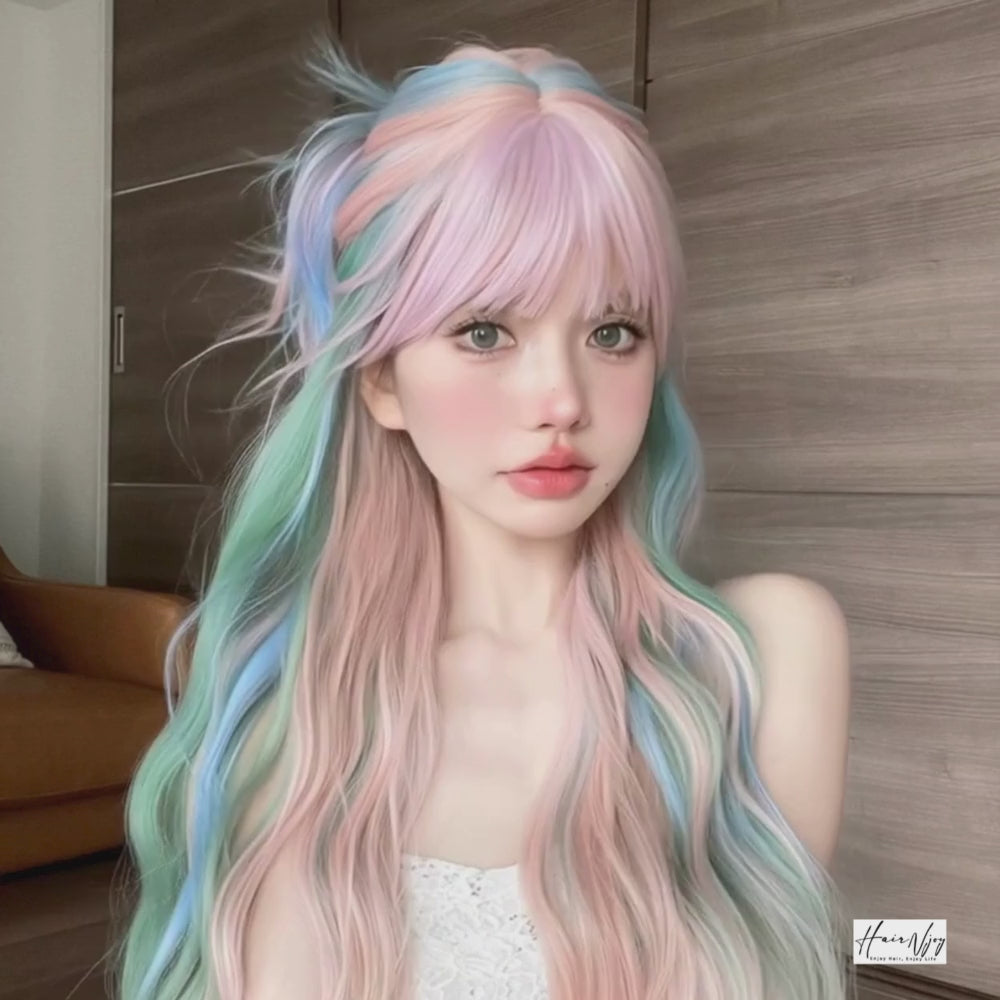 Design: Long wavy synthetic wig in a vibrant iridescent rainbow color with stylish bangs, perfect for making a bold statement.