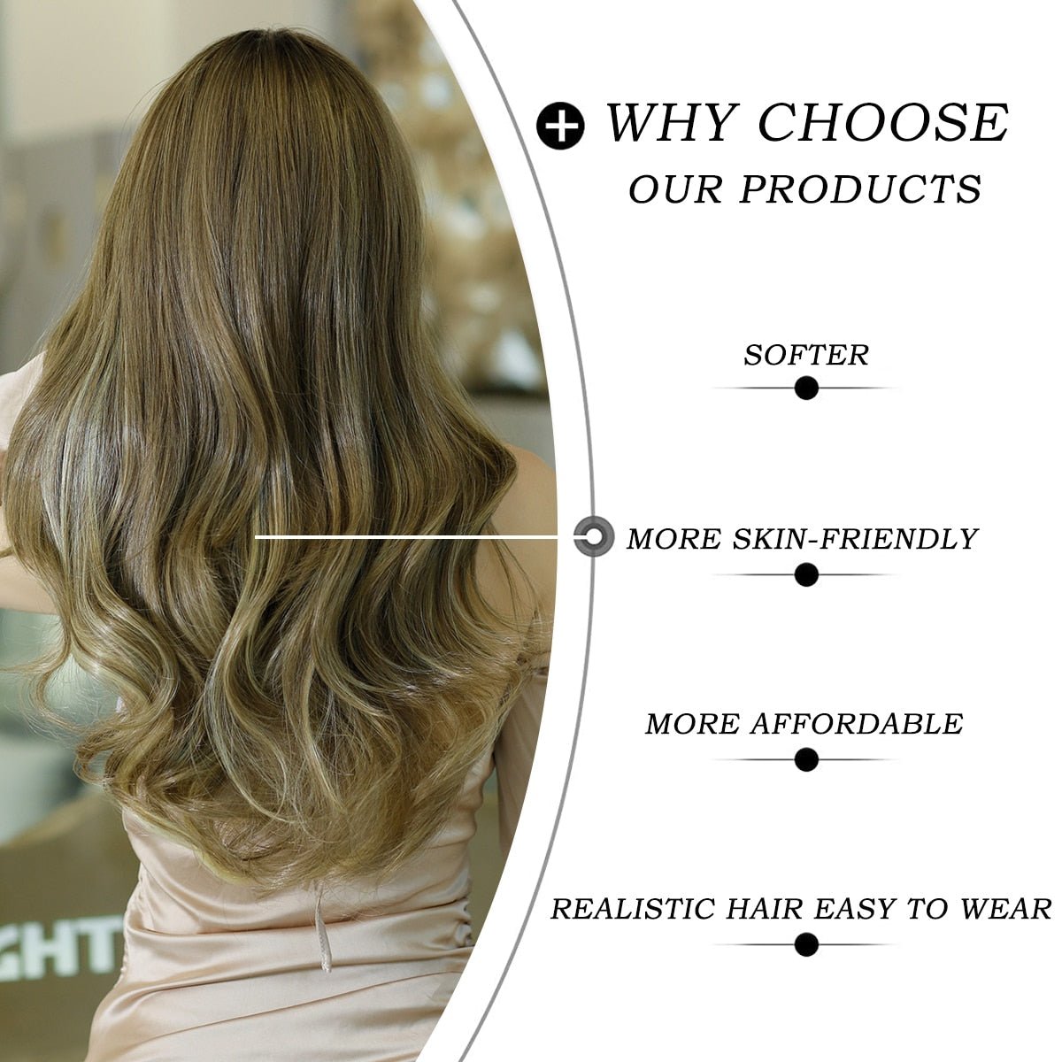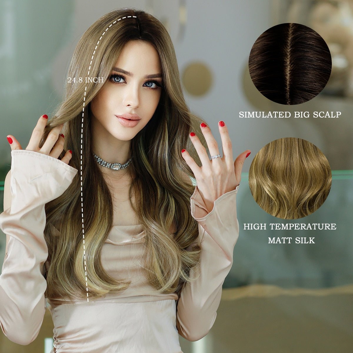 Peluca larga ondulada con reflejos en color castaño claro y flequillo