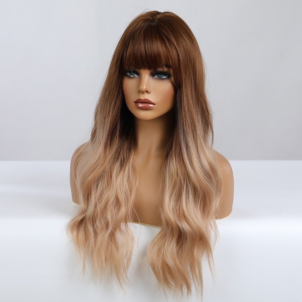 Peluca sintética ombré rubia champán ondulada larga con flequillo
