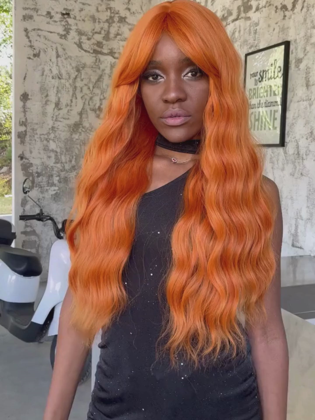 Design: A vibrant orange wavy wig with long bangs, adding volume and a bold, stylish touch.