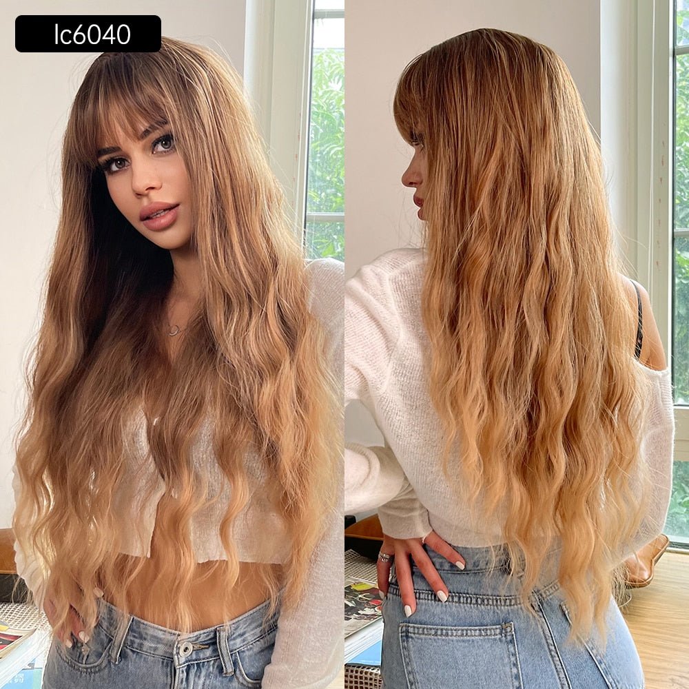 Perruque Synthétique Longue Ondulée Blonde Miel Avec Frange
