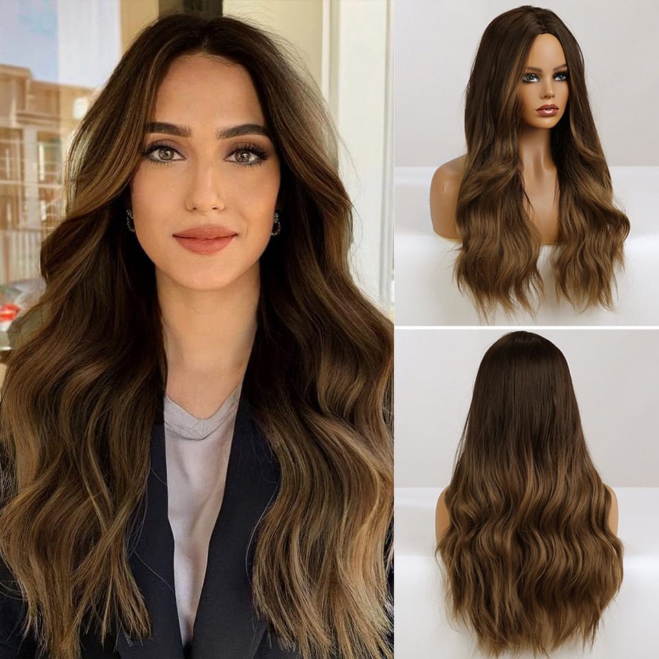 Perruque Synthétique Longue Ondulée Ombre Brune