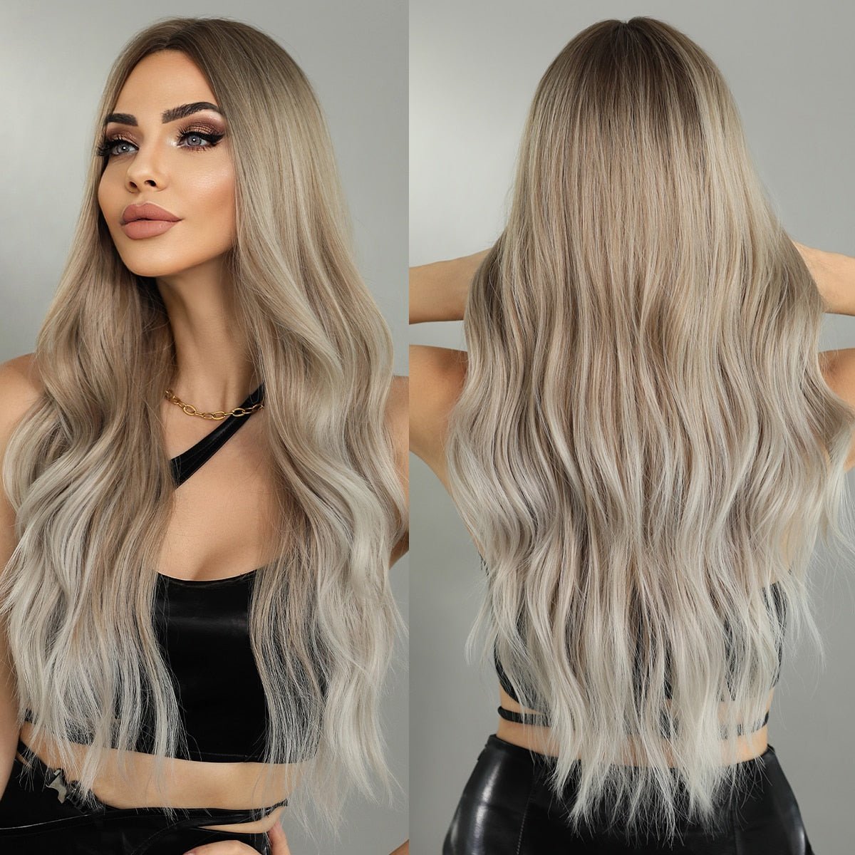 Perruque Synthétique Longue Ondulée Ombre Highlight Blond Cendré