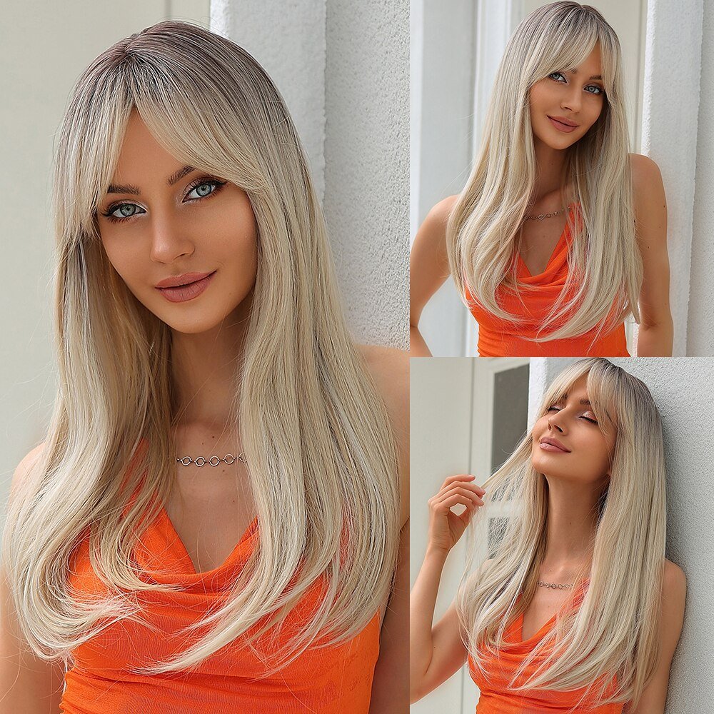 Ombre blonde longue perruques synthétiques ondulées avec frange perruques de vague de corps