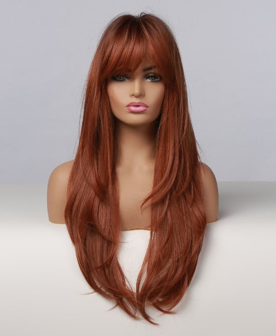Perruque Synthétique Longue Couche Brune au Gingembre avec Frange