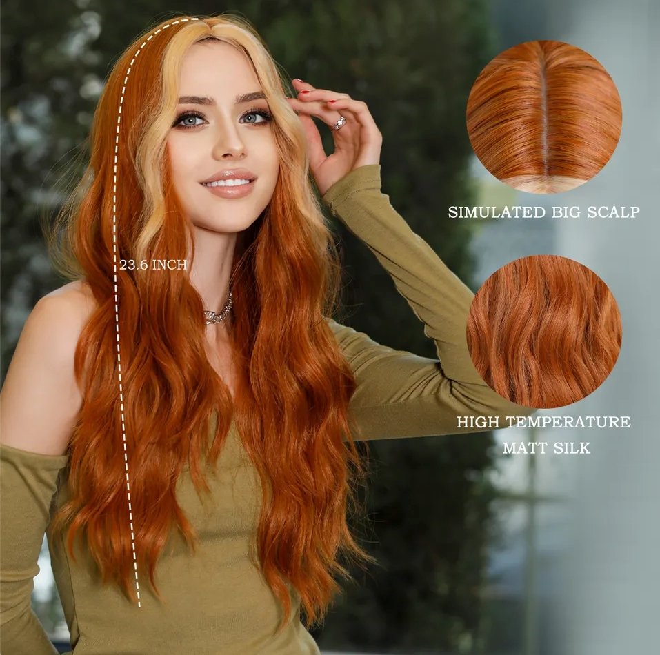 Perruques synthétiques longues ondulées au gingembre avec frange Perruques Body Wave