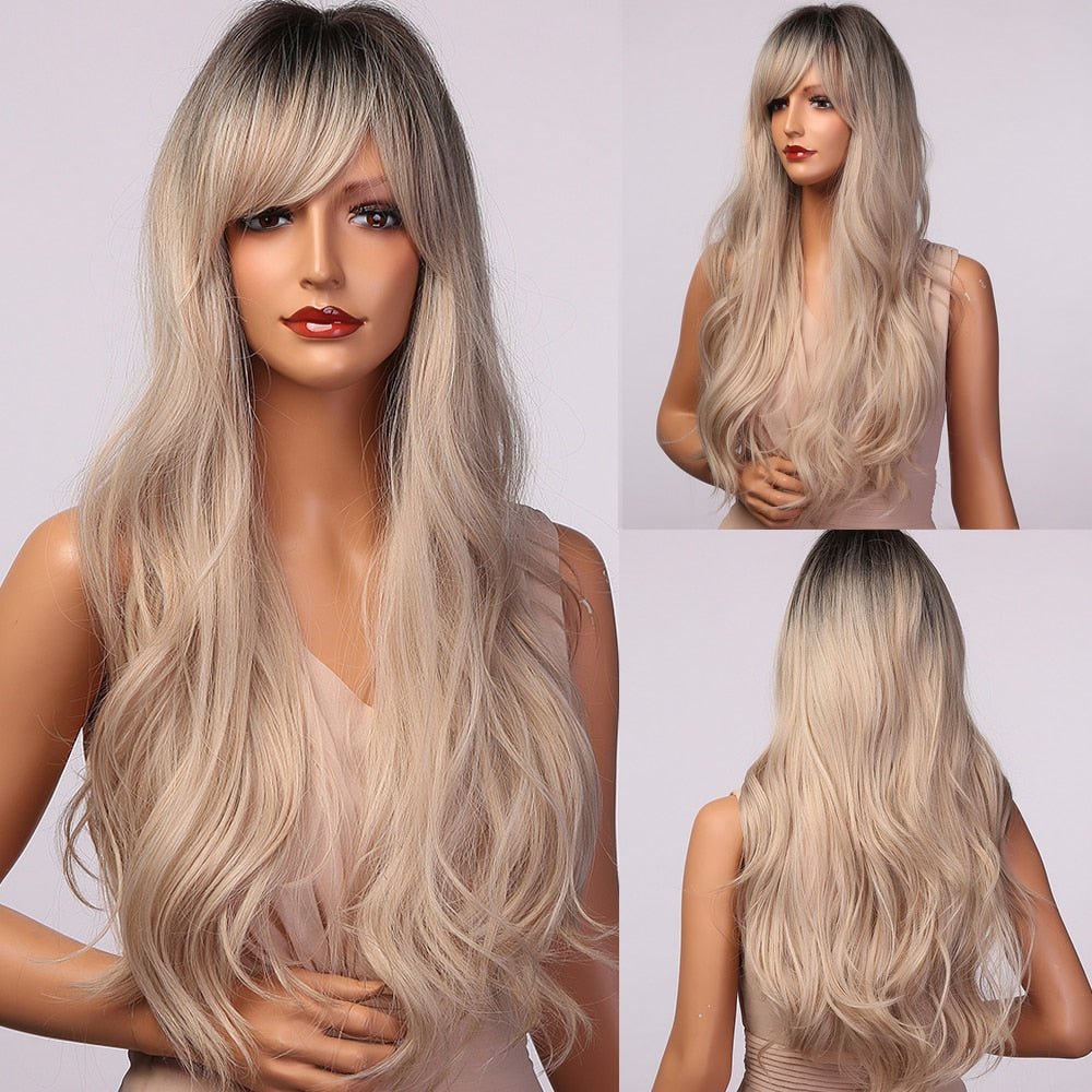 Perruque Longue Vague Platine Ombre Sale avec Frange