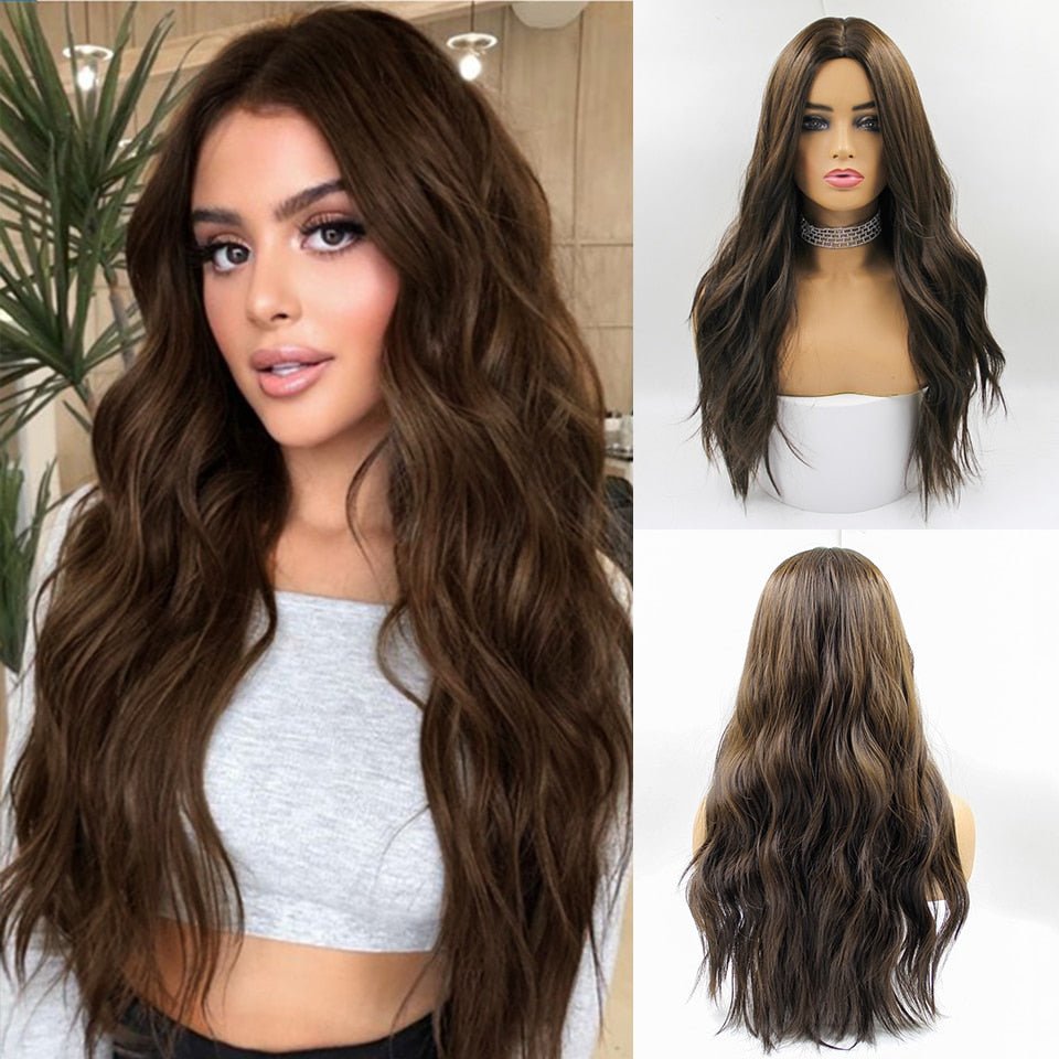 Perruque Synthétique Longue Ondulée Marron Clair Naturelle