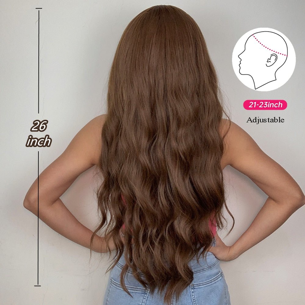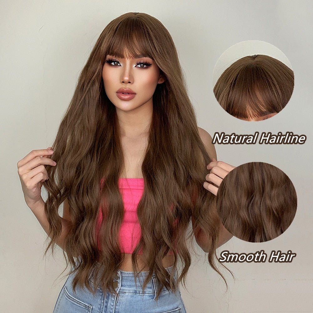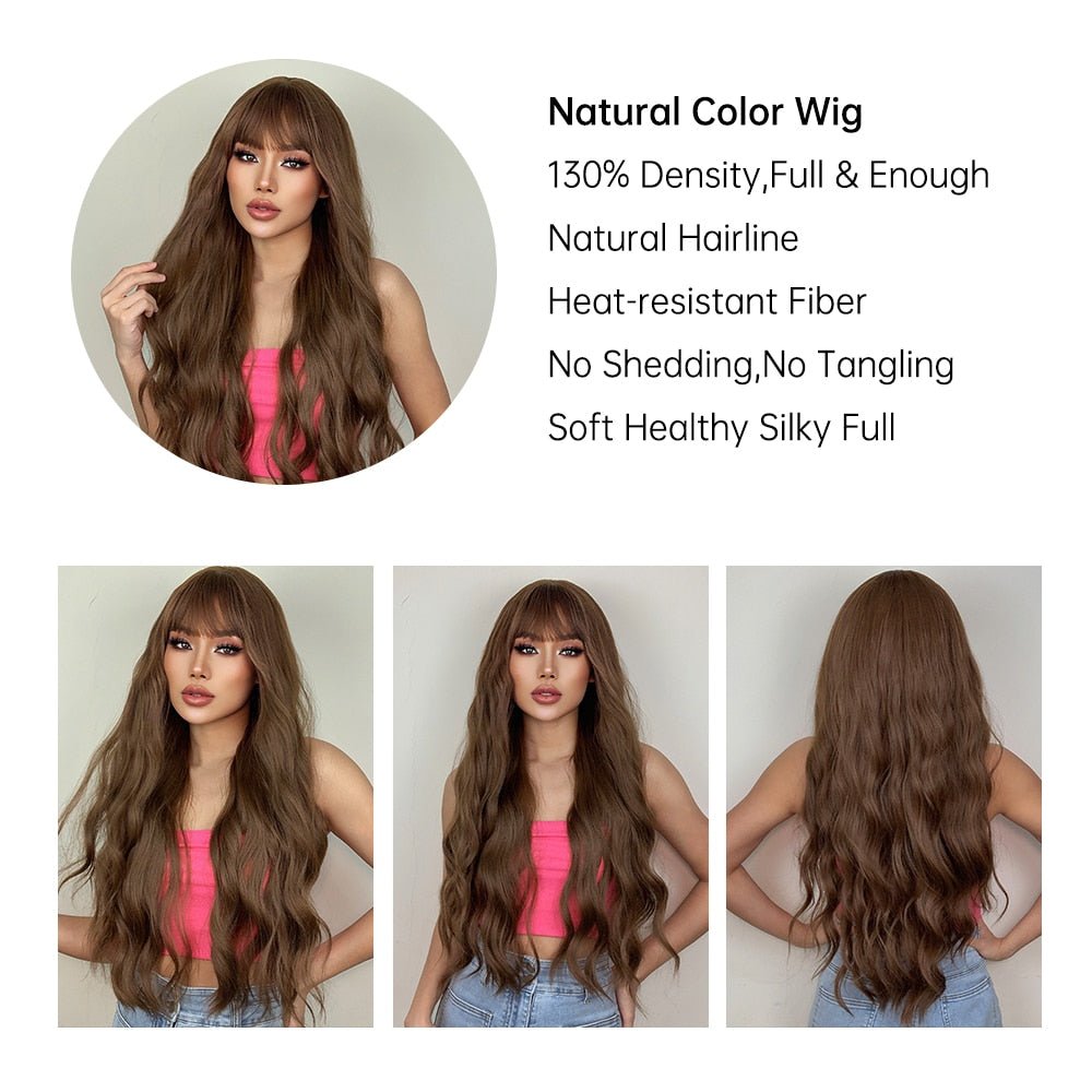 Design: A beautiful long wig featuring rich brunette waves and stylish bangs, with 130% density for a natural, full-bodied, and soft look.