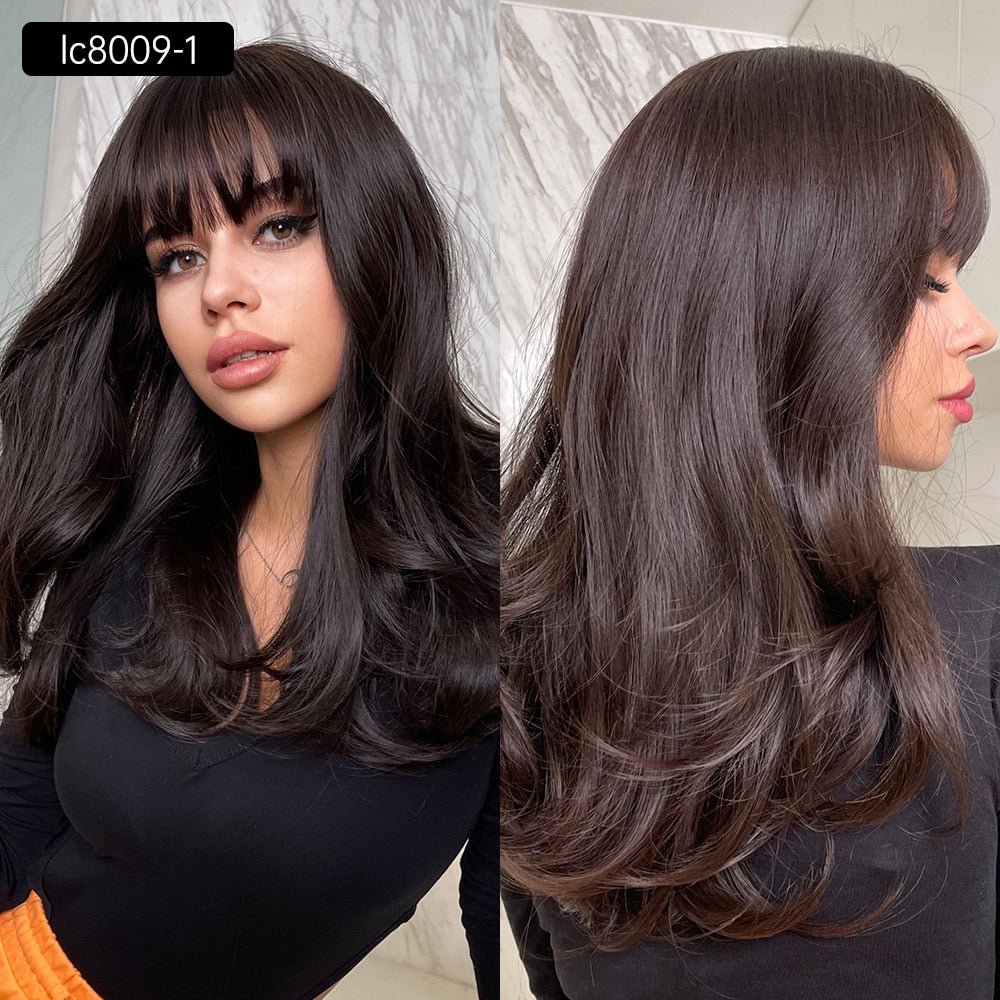 Design: A long, wavy wig in a rich dark brown shade, featuring full bangs for a soft, elegant, and timeless look.