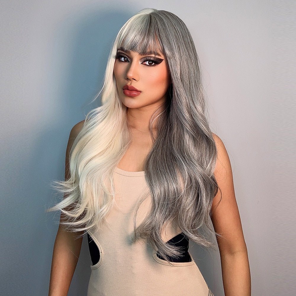 Design: A bold and elegant long wig featuring soft waves and full bangs, blending platinum blonde and grey tones for a chic gradient look.